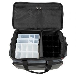 Tillverkad av vattentätt material och en hård, stabil botten gör den här väskan perfekt för båten, stranden, eller där du behöver den. Den levereras med fyra stora tackelboxar varav två höga och två låga, och tre externa fickor, så att du får med dig allt du behöver för en heldagstur.