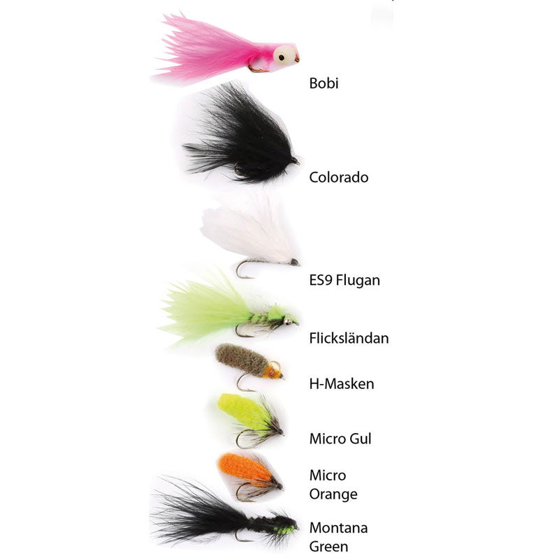 • Flugor: Bobi, Colorado, ES9 Flugan, Flicksländan, H-Masken, Micro Gul, Micro Orange, Montana Grön.