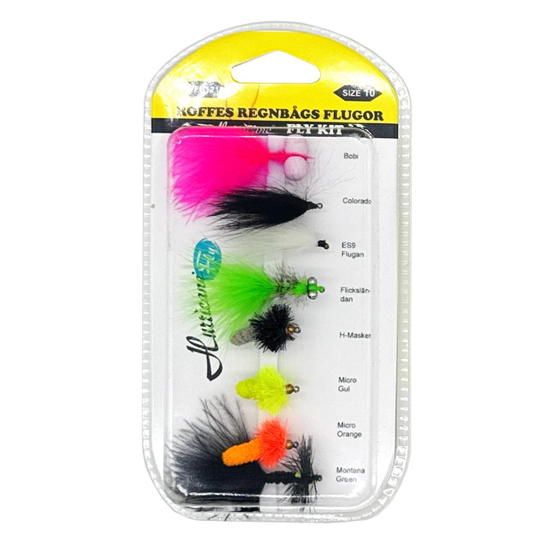 Flugkollektion Roffes Regnbågsflugor är åtta noga utvalda flugor som fungerar bra för fiske efter regnbåge i olika förhållanden. Riktigt fina regnbågsflugor, bundna på kvalitetskrok och med gedigen bindkvalitet. Perfekt till den som vill testa på flugfiske eller varför inte som present.