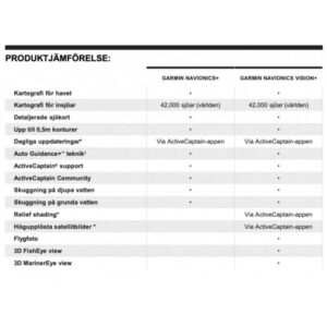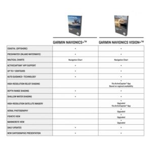 Sjökorten har skuggade djupkonturer för att hjälpa till med navigering på grunt vatten och för att hitta de bästa fiskeplatserna. Med en ny avancerad Auto Guidance+-teknik för bästa val av vägledning på vattnet och detta med hjälp av Garmin och Navioncs ruttlösning nu är integrerade. Tillgång till dagliga uppdateringar via ActiveCaptain®-appen för den senaste sjökortsdatan.