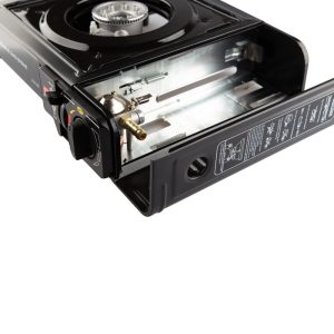 Gasolplatta som levereras i plastportfölj som skyddar och förenklar vid transport. Laddas med engångsbehållare eller ansluts till extern gasoltub. Effekt upp till 2,9Kw. Storlek 33,5 x 25,5 x 8,5cm. Vikt 1,6kg..