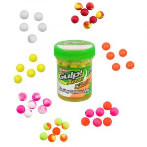 Gulp Alive Salmon Eggs är flytande kulor som imiterar laxägg. En storsäljare till regnbågsfiske. Helt biologiskt nedbrytbar och med extremt långvarig doft och smak. Gulp är det bästa alternativet till levande bete som någonsin har producerats. Kulorna ligger marinerade i vätska med attraherande doft för att fånga mer fisk. Man kan återanvända betet genom att placera det i burken igen så det får suga åt sig av ny doft. Mycket populära till bottenmete efter regnbåge.