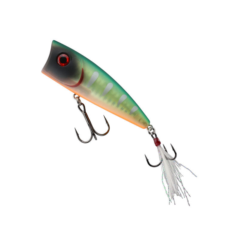 En poppers främsta uppgift är att reta rovfisken till attack, och detta bete gör just det. När du rycker hem det skapar det ett tydligt “plopp”-ljud samtidigt som det skjuter vatten framför sig. Kombinationen av ljud, rörelse och svallvågor gör att rovfisken snabbt lokaliserar betet, även på längre avstånd.