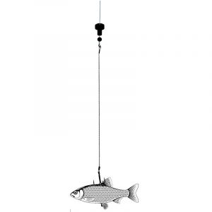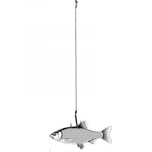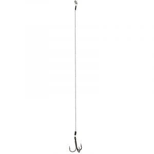Tafsen har en helsvetsad metallring i ena änden att knuta linan i, och en sylvass trekrok i storlek 4 i andra änden.