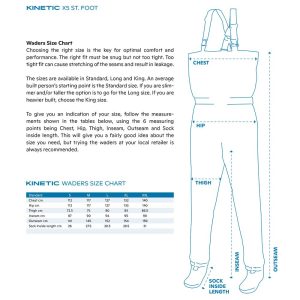 Kinetic X5 vadarbyxa med neoprenfot är byggda för att hålla dig torr och bekväm hela dagen i vattnet. Dessa vadare är extremt andningsbara och tillverkade av 5 lager vattentät polyester i kombination med PROxTEX-membran. Tejpade, limmade och sydda sömmar hindrar vatten från att sippra in. Förstärkta knän skyddar mot slitage när du går genom buskar/sly och knäböjer på stranden. Fasta grusskydd håller skräp och grus borta från dina kängor. Helt justerbara hängslen och ett medföljande vadarbälte ger en utmärkt anpassad passform. Tejpade neoprenfötter.