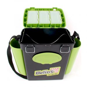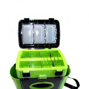 Invändigt finns 3 st förvaringsfack i locket där t ex pirkar, handvärmare med mera kan förvaras. Framtill finns ett hål där plastkasse kan monteras för att smidigt lägga i fisken i skryllan.