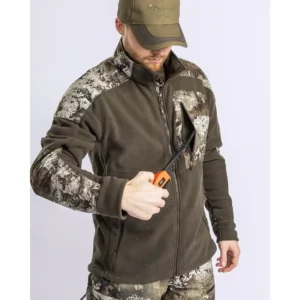 Fleecejacka av återvunnen polyester med vattentäta paneler på axlar, bröst och underarmar i 2-lagers laminerat kamouflagetyg som skyddar dig mot väta när du tar dig fram i terrängen. Fleecejackan har handfickor med dragkedja där du säkert kan förvara dina saker, samt en bröstficka försedd med antennöppning. För en tightare passform nedtill kan botten av fleecen justeras med dragsko. Det mjuka fleecetyget gör jackan tyst och perfekt för smygjakt. Den här jackan bäras hela hösten, antingen som ytterplagg under de varma dagarna eller under en jacka när kylan kommer.