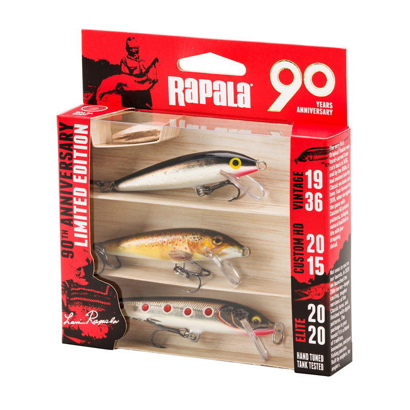 Exklusivt jubileumspaket från Rapala för öring- och abborrfiske. Innehåller tre Original Floater-wobblers i naturtrogna färger – handjusterade, vattentestade och redo att användas direkt.