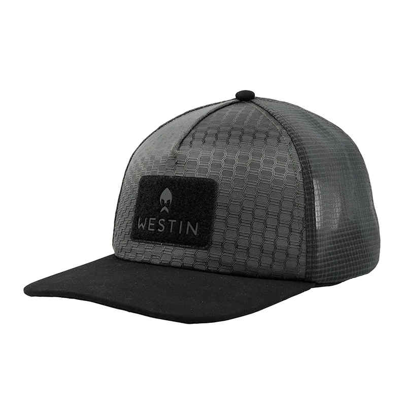 Modern truckerkeps med hexagonmönster, ventilerande mesh och platt visir – perfekt för varma fiskedagar.