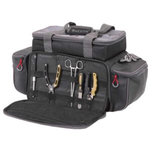 Med Westin W4 P&T Master Bag är du väl förberedd för alla dina fiskeäventyr. Väskan erbjuder ett stort huvudfack som rymmer fem högkvalitativa Westin Tackle Boxes, samt ett toppfack med en praktisk EVA-hållare för burkar och beten. Sidofickorna ger dig extra utrymme för tillbehör och småsaker, och den förstärkta, vattentåliga konstruktionen skyddar din utrustning från väder och vind.